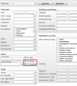 For å finne etter inaktive deltakere, anbefaler vi å lage et søke-filter i navigator der du huker av for «Passiv» og «Avsluttet»: