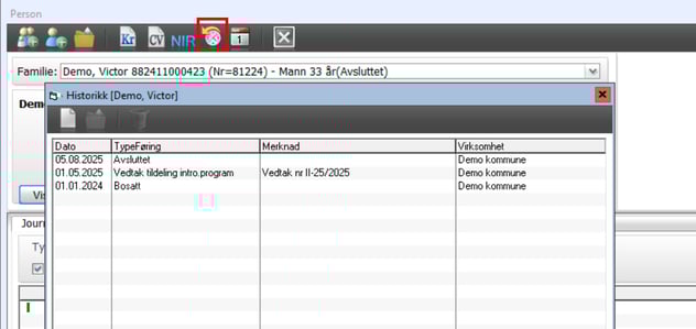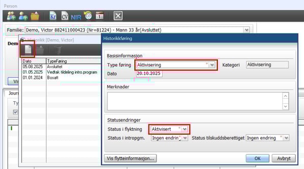 Dersom man skal aktivere en deltaker som er registrert fra før, men har status passiv eller avsluttet, kan man enkelt gjøre det via historikkføring (klokka).