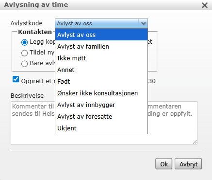 Avlysninger kan omfatte situasjoner der familien/personen ikke møter opp, kontakter helsestasjonen for å avlyse og samtidig ber om ny time, eller når helsestasjonen selv må avlyse en avtale.