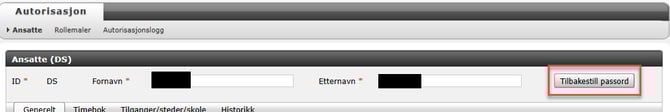 Gå deretter til fanen Kartotek – Ansatte. Søk opp din kollega (velg Alle steder og Alle fagkoder). Navnet til din kollega vises med blå skrift dersom du har riktig tilgang. Klikk på navnet, og i neste bilde finner du knappen Tilbakestill passord oppe til høyre. Klikk på Tilbakestill passord, deretter Lagre, og til slutt Lagre igjen.