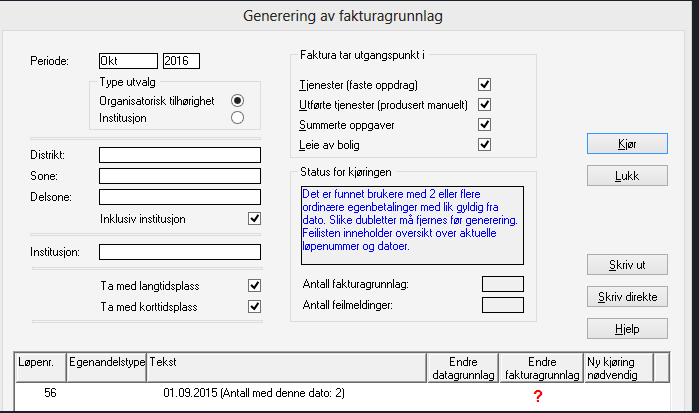 Feilmelding ved generering av fakturagrunnlag "Det er funnet brukere med 2 eller flere ordinære egenbetalinger med lik gyldig fra dato. Slike dubletter må fjernes før generering. Feillisten inneholder oversikt over aktuelle løpenummer og datoer. (se også vedlegg som viser et eksempel på aktuelle feilmelding)