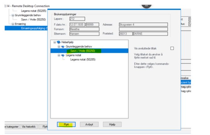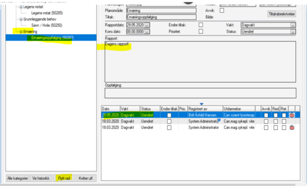 Dersom en rapport er knyttet til feil tiltak, kan du flytte den til riktig tiltak. Start med å markere ønsket bruker, gå deretter inn i pasientjournalen, gå ned til rapportnivå, og marker rapporten du ønsker å flytte.