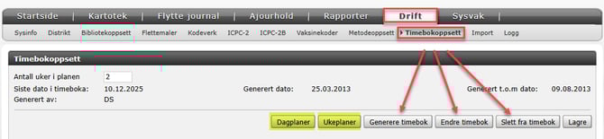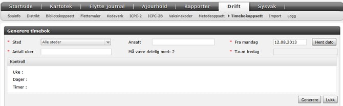 Timeboka genereres alltid fra mandag i en uke. Bruk knappen Hent dato for å velge startdato i kalenderen. I feltet Antall uker legger du inn hvor mange uker som skal genereres. Du må velge hele uker, og antallet må være delelig med 4 (minimum 4 uker). Datofeltet under viser til og med dato timeboka blir generert.