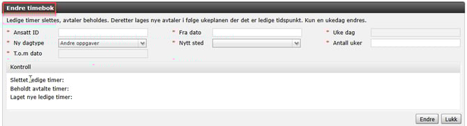 Du velger Fra dato, fra hvilken dato skal timeboka endres, Ny dagtype, antall uker du skal endre, og Ansatt ID . Når du trykker knappen Endre, vil telleverket gå til venstre, ledige timer blir slettet, avtalte timer beholdes og det lages nye ledige timer.