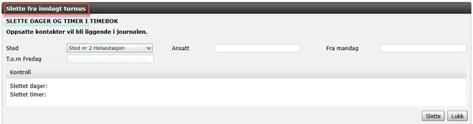 I dette bildet kan du slette dager og timer for enten én ansatt (da velger du ansatt i feltet for ansatt) eller slette for alle ansatte (da setter du feltet ansatt tomt, og HsPro forstår at du vil slette for alle). Velg tidsrom fom mandag tom fredag, og trykk Slett.