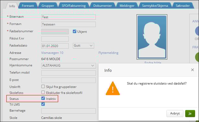 - Under fanen 'Info' på elevkortet: Aktiver feltet 'Inaktiv'.