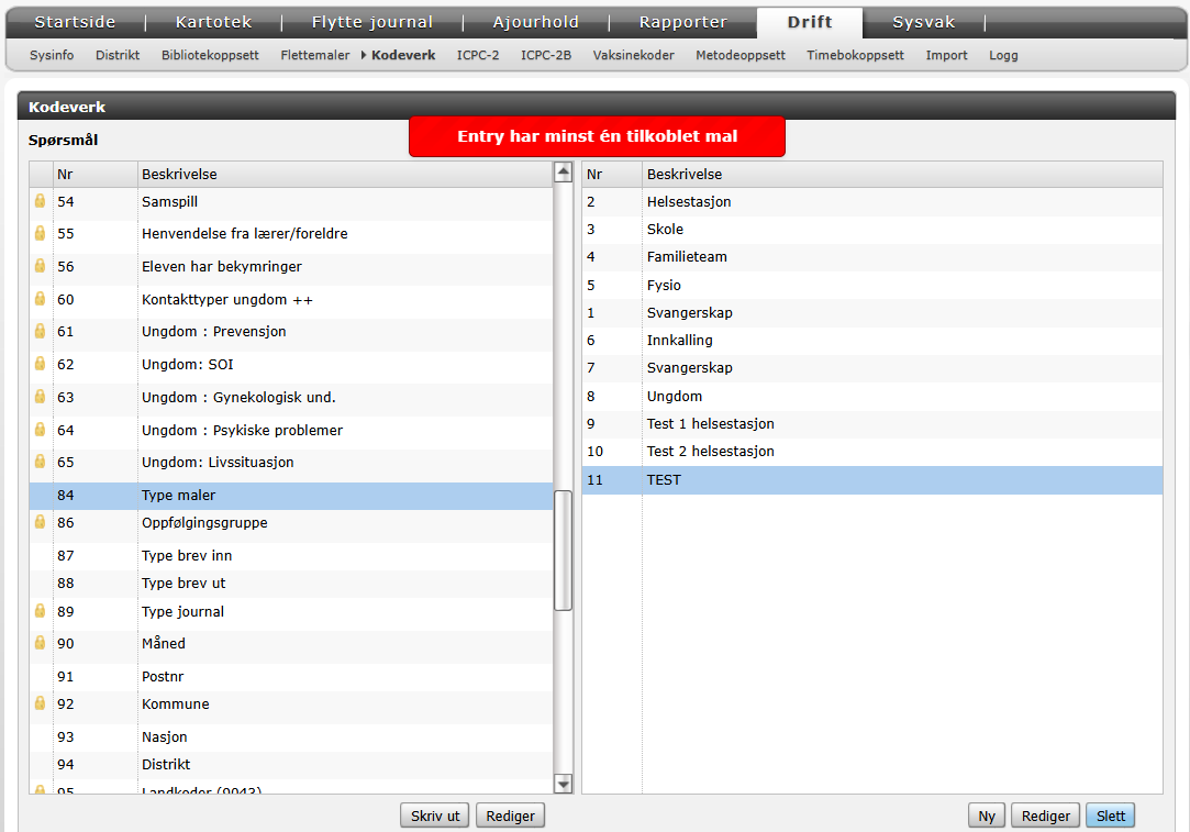 ✉️Gå til fanen Drift – Kodeverk – Nr. 84. Her kan du markere maltypen og klikke «Slett».
