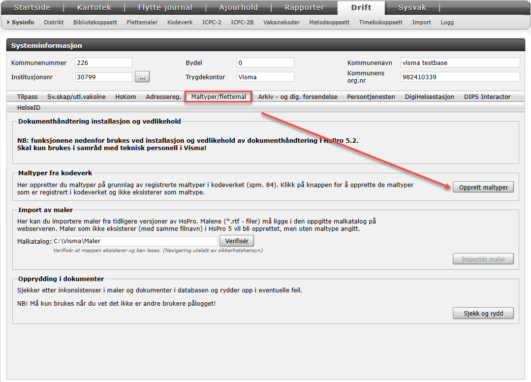 Dersom du får slettet maltypen, bekrefter ved å klikke «Ja» på spørsmålet om du vil slette, må du deretter gå til fanen Drift – Maltyper/flettemaler og klikke Opprett maltyper