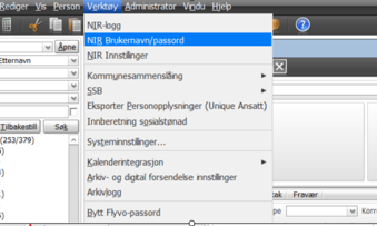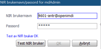 - At "NIR brukernavn og passord" er i orden. Denne finner man under nedtrekksmeny "verktøy" og det er kun den personen som er satt som rapporteringsansvarlig som vil ha denne menyen tilgjengelig. Her må personens brukernavn og passord fra IMDI-nett legges inn med format "0000-abcd@prodimdi" og man må få blå skrift "ok" ved å teste NIR-brukeren. Se vedlagte bilder under.