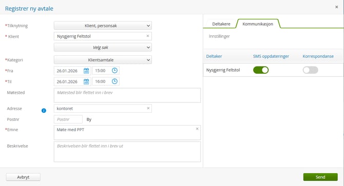 Dere velger selv om varsel på SMS skal sendes ut knyttet til avtaler i løsningen under menyvalget Administrasjon-innstillinger-avtaleinnstillinger. Når avtalebok og sms-varsling er aktivert i innstillinger kan du opprette avtaler og velge sms-varsling som kommunikasjon.