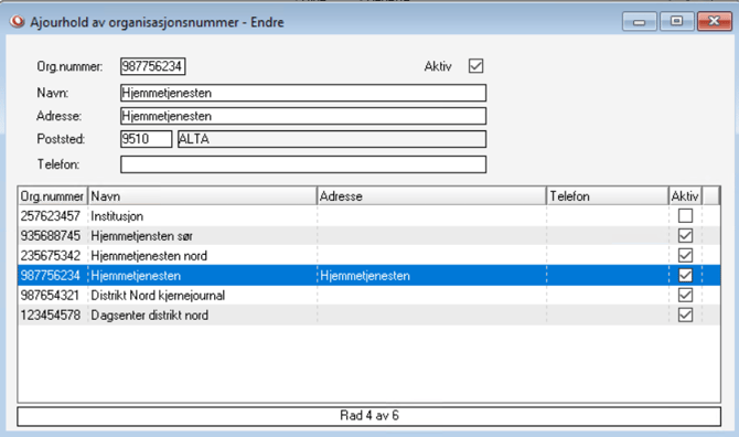 Organisasjonsnummer for dagaktivitetstilbud registreres under "Organisasjon/Geografi" – "Organisasjonsnummer (næringskoder)" – "Ajourhold av organisasjonsnummer".
