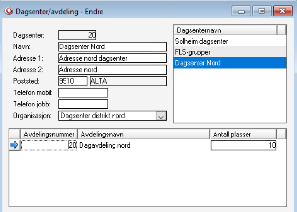 Dersom ett org.nr. skal gjelde for hele dagsenteret og eventuelle underavdelinger, knyttes dette fra "Organisasjon/Geografi" – "Dagsenter/avd.".