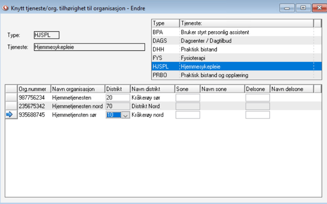 Når organisasjonsnummeret er knyttet til riktig distrikt, sone eller delsone, vil alle brukere i det aktuelle distriktet automatisk få oppdatert sine tjenester (for eksempel praktisk bistand, hjemmesykepleie) med korrekt organisasjonsnummer i tråd med tilhørigheten. Det betyr at man kun behøver å foreta manuell tilknytning for de tjenestene som eventuelt skal rapporteres mot et annet distrikt enn det deres organisasjonsnummer tilsier. Dersom det gjøres manuell registrering, vil dette overstyre den automatiske knytningen.