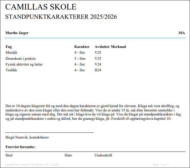 Utskriften er delt inn i en side per elev. Nederst på siden vises teksten om klagerett, samt at det er et signaturfelt for kontaktlærer og et for at det er forevist foresatt.