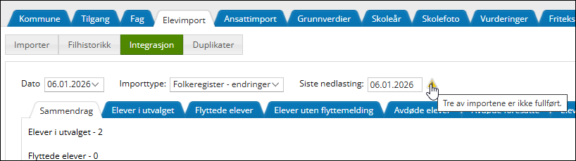 Hvis man under 'Elevimport' - 'Integrasjon' ser feilmeldingsikon som igjen viser teksten "XX av importene er ikke fullført", så har endringsimportene blitt stoppet pga ubehandlede duplikater.