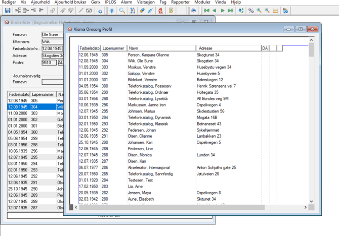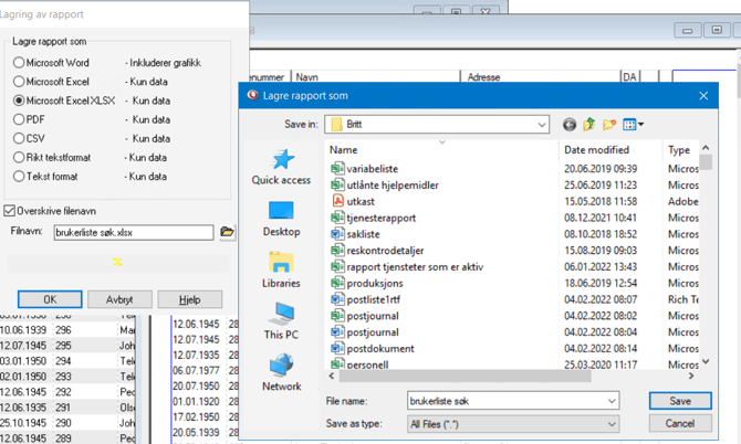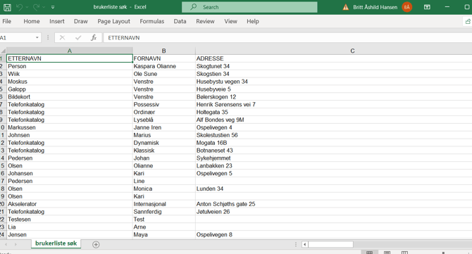 Eks. viser søk i brukerliste før lagring til fil/Excel