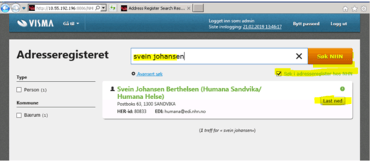 Når du har funnet ønsket lege eller forbindelse, klikker du på Last ned. Da blir den valgte legen eller forbindelsen lagt til i det lokale registeret.