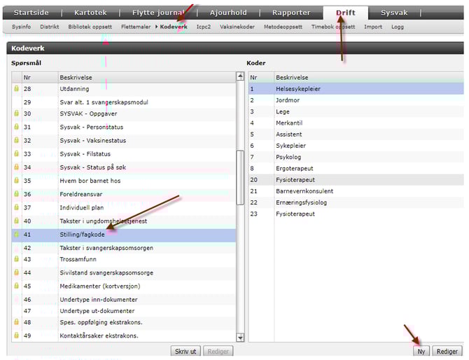 Fagkode legges inn via: Drift – Kodeverk – Spørsmål 41 – Ny
