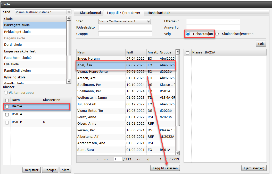 Dersom journalen ligger på helsestasjonen, vil den automatisk flyttes til Skolehelsetjenesten samtidig som du legger inn eleven i klassen. Marker eleven og trykk Legg til i klassen.