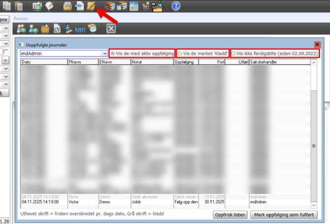 Hvordan bruke/følge opp deltakere gjennom funksjonen "Oppfølging journal" / "Uoppfulgte journaler"