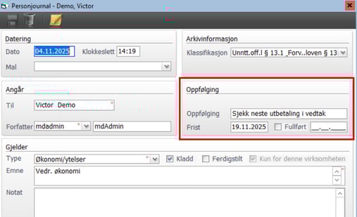 Denne funksjonen er nyttefull av flere grunner, men hovedsaklig er det en funksjon for oppfølging av deltakere over tid, gjennom dokumenter, notater og kontroll av dokumenter med tanke på ferdigstilling (til VSA og SvarUt).