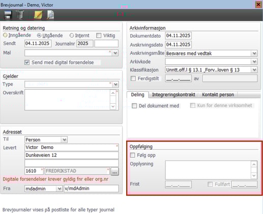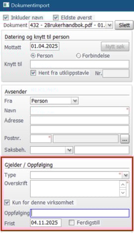 I denne menyen vil man kunne finne personer med dokumenter som har fått satt/laget en aktiv oppfølgingsoppgave. Dette kan gjøres fra dokumentimport-bildet, ny brevjournal og personjournal.