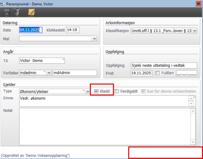 Kladd finnes på personjournal og kan kun gjøres på et notat og ikke andre dokumenter. Når denne er påsatt vil den dukke opp i "Oppfølging journal" under "Vis de merket Kladd". Med denne påsatt vil notatet ikke bli ferdigstilt automatisk (ihht. antall dager oppsatt i kontroll-fanen i systeminnstillinger). Vær obs at utgangspunktet må være at man ferdigstiller et notat når man er ferdig slik at man unngår at andre har mulighet til å redigere notater fra andre. Merk at med hake påsatt kladd vil teksten nede til høyre i vinduet om automatisk ferdigstilling etter lagring ikke er tilstede.