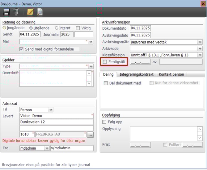 Først og fremst er denne listen viktig for å raskt sikre/skaffe oversikt over hva som IKKE er ferdigstilt fra fagsystemet. Denne listen snakker også med "restanselisten" som man finner inne i arkivkjernen (VSA). Det vil si, en arkivar med kun tilgang til arkivdelen vil kunne se restanselisten som speiles av det man finner i "ikke ferdigstilte".
