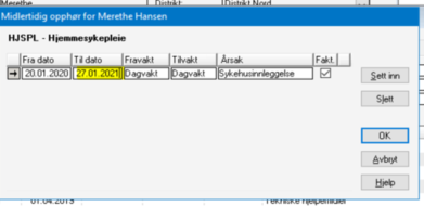 Ved midlertidig opphør vil brukeren ikke vises i arbeidslister og ukeplaner. Kontroller om det finnes aktive perioder med midlertidig opphør registrert på brukeren, eller om det finnes en feil i datoangivelse som kan kan medføre at oppgaven utelates, som feks. dato/år.