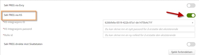 Aktiver Søk FREG via KS: og fyll inn de obligatoriske feltene (KS integrasjons ID, KS Integrasjons passord og Rolle id) og sjekk forbindelsen.