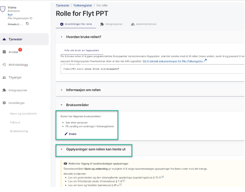 Etter at rollen er opprettet vil den få tildelt en rolle-ID. Denne rolleID'en skal legges til slutt inn i Visma Flyt under Administrasjon og oppsettet av KS Folkeregister.