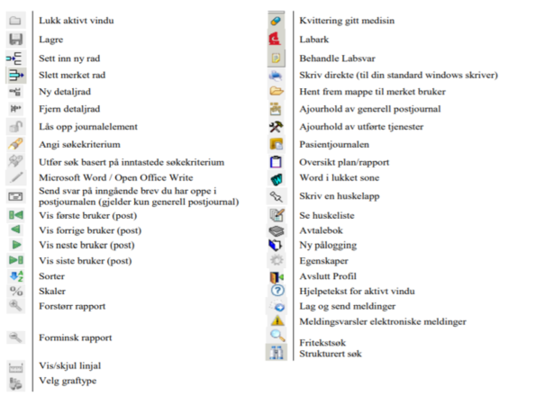 Liste over tilgjengelige hurtigtaster/verktøyknapper/ikoner