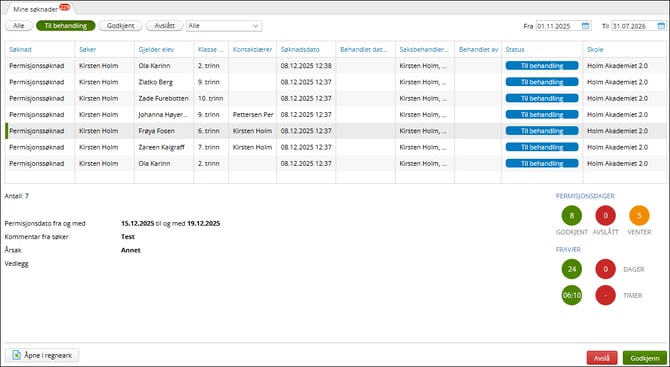 - Filtrere på type søknad; Alle, Permisjon, Skoleskyss, Redusert betaling og Skolebytte