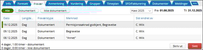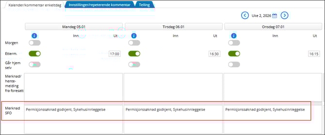 Når en permisjonssøknad er godkjent, registreres det fravær det det er relevant, både mot fraværsfanen til elev, og merknader mot SFO tilstedeværelse.