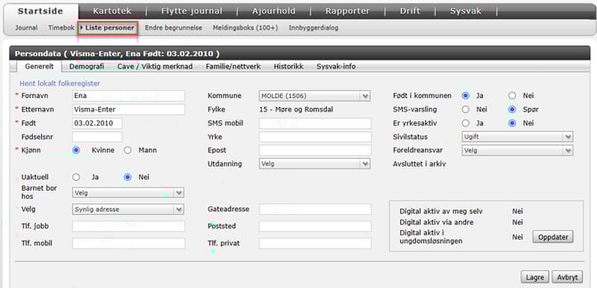 • Fyll ut personkortet. Du kan hente opplysninger fra Lokalt folkeregister eller via NHN direktesøk (se eget punkt). Husk Lagre når registreringen er fullført.
