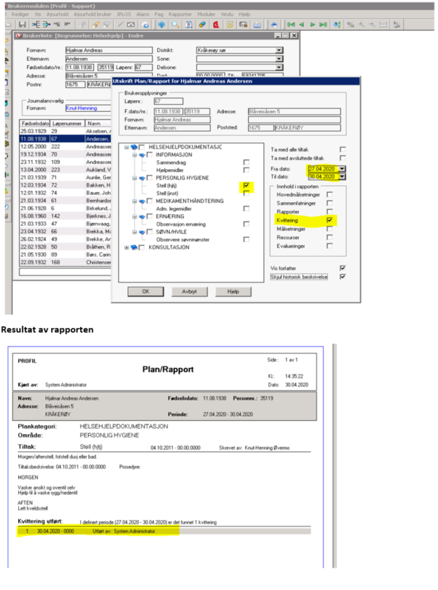 Marker pasienten i brukerlisten, høyreklikk og velg «Utskrift plan/rapport». Alternativt kan du velge «Fag» i verktøylinjen og deretter «Utskrift plan/rapport». I bestillingsvinduet velger du kun kvittering, angir ønsket periode og markerer aktuelle tiltak.