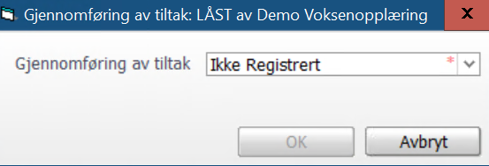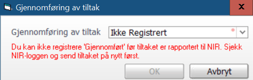 Ved forsøk på rapportering av gjennomførte timer uten at tiltaket er rapportert til NIR vil følgende melding dukke opp: