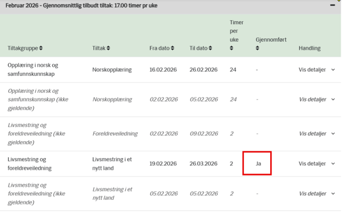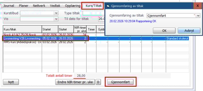 Fra versjon 9.6 er det nå mulig å registrere tiltakstypene Livsmestring og Foreldreveiledning som "gjennomført" gjennom egen ny knapp på skillearket "Kurs/Tiltak" på person.