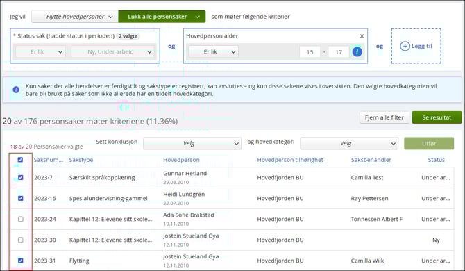 - Man kan kun masseavslutte personsaker der feltet 'Sakstype' er fylt ut