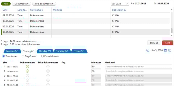 - Gjør justeringer nederst i skjermbildet, for eksempel dersom et fravær skal endres fra "Ikke dokumentert" til "Dokumenter", klikk på dokumentert-ikonet.