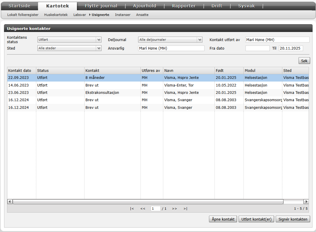 For å finne usignerte kontakter går du til Kartotek og velger Usignerte. Her får du oversikt over alle utestående kontakter.